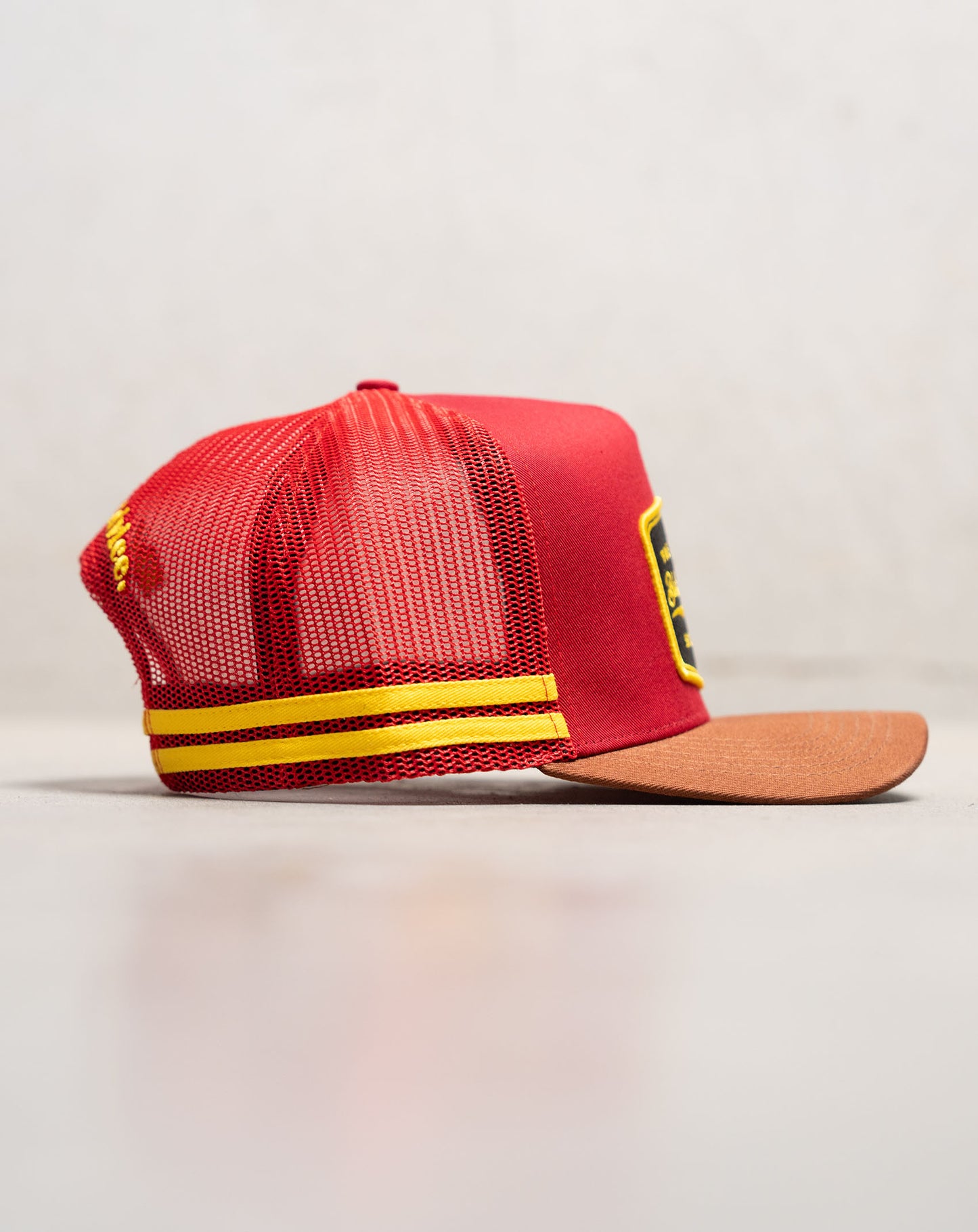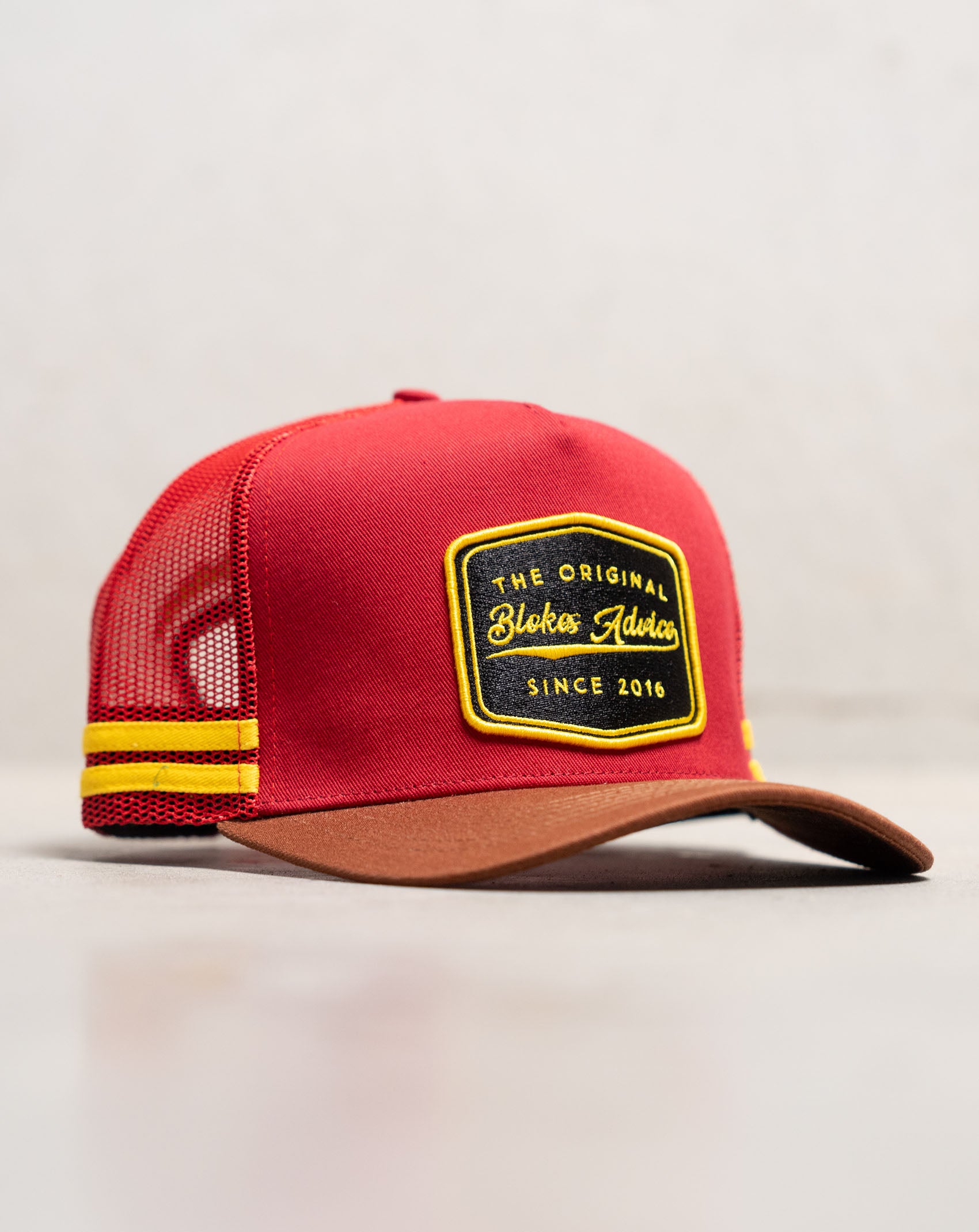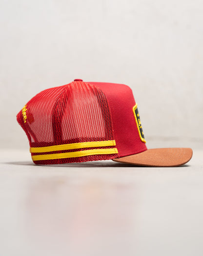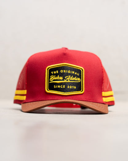 We love a black hat as much as the next man, but they all start looking the same. The Stay Hard Trucker is a bit of astatement for the next time you're down the track or sinking a few pints at the local. Featuring the bold red & yellow colourway with a brown brim, and a woven embroidered patch to finish her off.